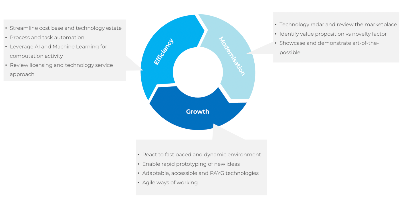 Businesses evolve and cycle through phases of growth, efficiency drives, re-organisations and modernisation.  Through all phases of this cycle, it is critical that there is a technology strategy in place aligning resources and investment to the priority business outcomes.  This technology strategy is there to ensure that technology and the teams that manage the technology are an engine of the change required to drive the business, rather than an inhibitor to it.  Often companies don’t have a technology strategy, or the technology strategy is an inward facing technology delivery plan, with vague goals or principles that are detached from the day-to-day operations.